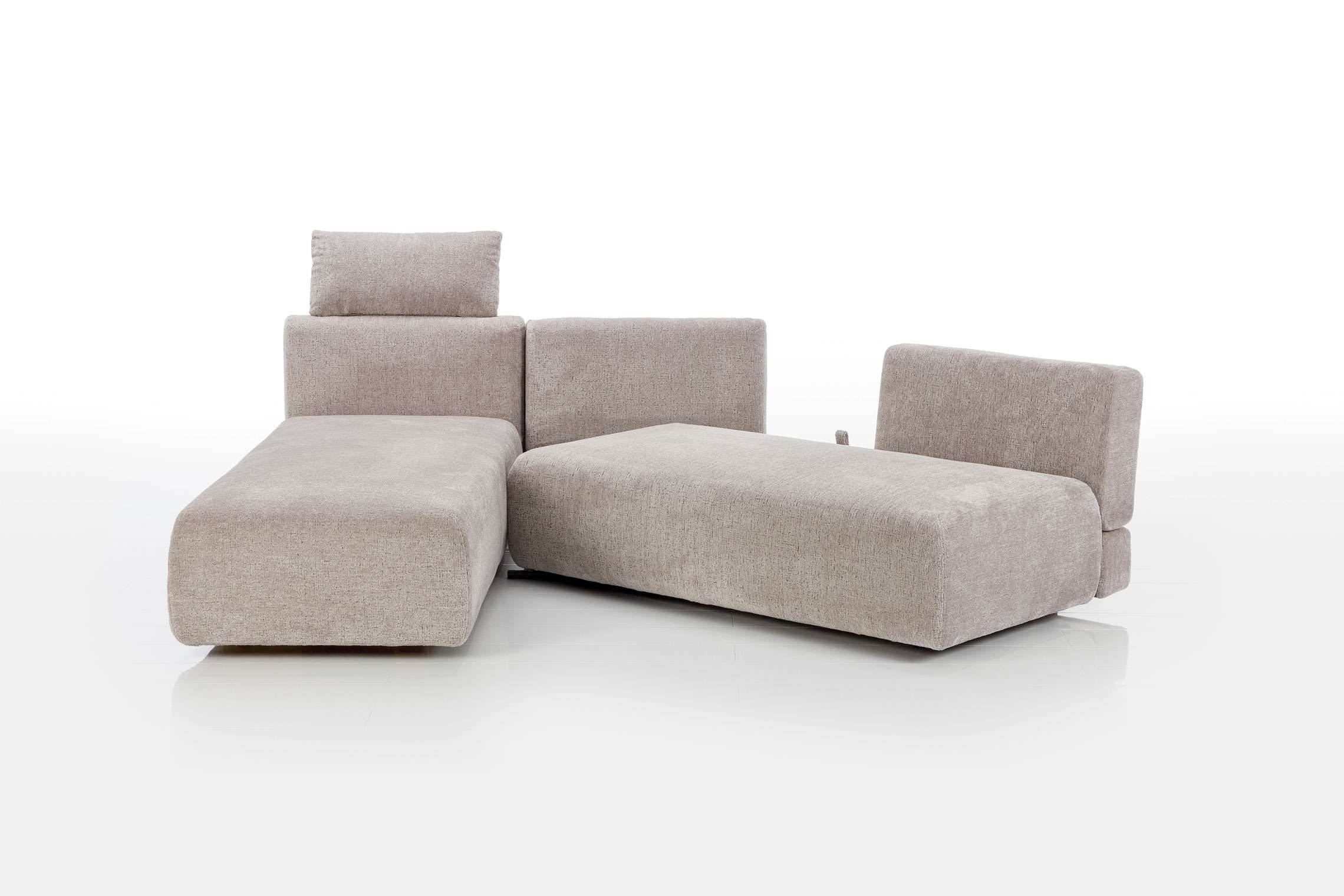 From the basic position as a corner sofa, piano small converts with utmost ease into a cosy upholstered area for reclining or sleeping, with the reclining area measuring 160 x 160 cm and the sleeping area 160 x 205 cm. For sleeping, it just takes one moment to lower the backrests.